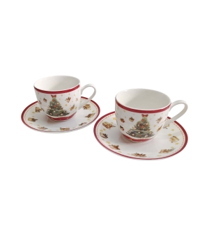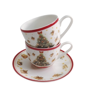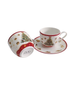 Táto sada dvoch šálok a podšálok na espresso CHRISTMAS TREE 3, ktorá je súčasťou vianočnej kolekcie, je vyrobená z porcelánu New Bone China, ktorý sa vyznačuje elegantnou a prírodnou krémovo-bielou farbou s jemným leskom a zároveň výnimočnou odolnosťou.