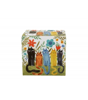 Líniu zdobí motív viacfarebných, nadýchaných domácich mačiek sediacich na rozkvitnutej lúke. Celý dizajn sa vyznačuje hravým štýlom a žiarivými, výraznými farbami.