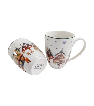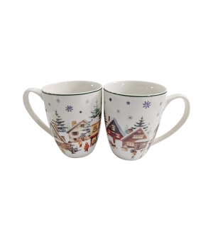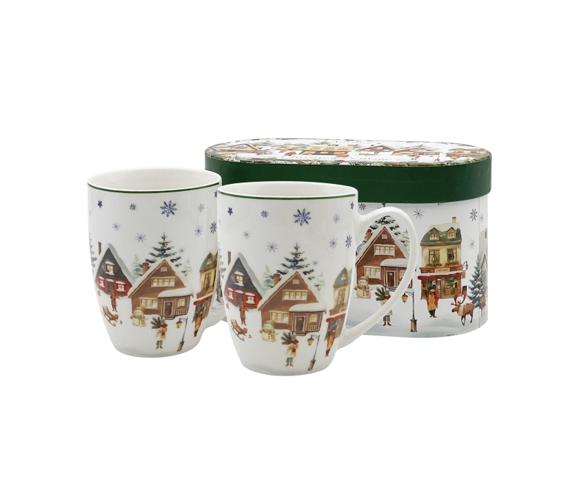Sada dvoch klasických hrnčekov CHRISTMAS VILLAGE z vianočnej kolekcie, vyrobených z porcelánu New Bone China, ktoré sa vyznačujú elegantnou a prírodnou krémovo bielou farbou s jemným leskom a zároveň výnimočnou odolnosťou.