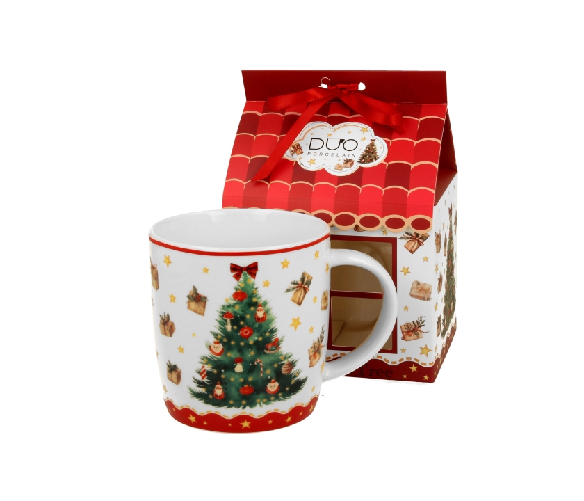 Hrnček CHRISTMAS TREE 3 s motívom domčeka, ktorý je súčasťou vianočnej série, sa vyznačuje prírodnou krémovo bielou farbou s jemným leskom a výnimočnou pevnosťou a odolnosťou, pričom si zachováva ľahký a elegantný vzhľad.