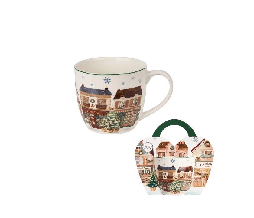 Hrnček „v košíku“ CHRISTMAS CITY 2 s objemom 460 ml, ktorý je súčasťou vianočnej kolekcie, sa vyznačuje prírodnou krémovo bielou farbou s jemným leskom a výnimočnou odolnosťou a dlhou životnosťou, pričom si zachováva ľahký a elegantný pocit.