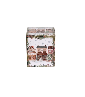 Kolekciu zdobí očarujúci motív maľovaných mestských domov, ktorý vytvára teplú a útulnú atmosféru. Trblietavé hviezdy, snehuliak a krásne ozdobený vianočný stromček vytvárajú jedinečnú a magickú atmosféru. Obklopená jemným rámom z vetvičiek cezmíny, celá kolekcia dodáva prvky typické pre sviatočnú výzdobu.