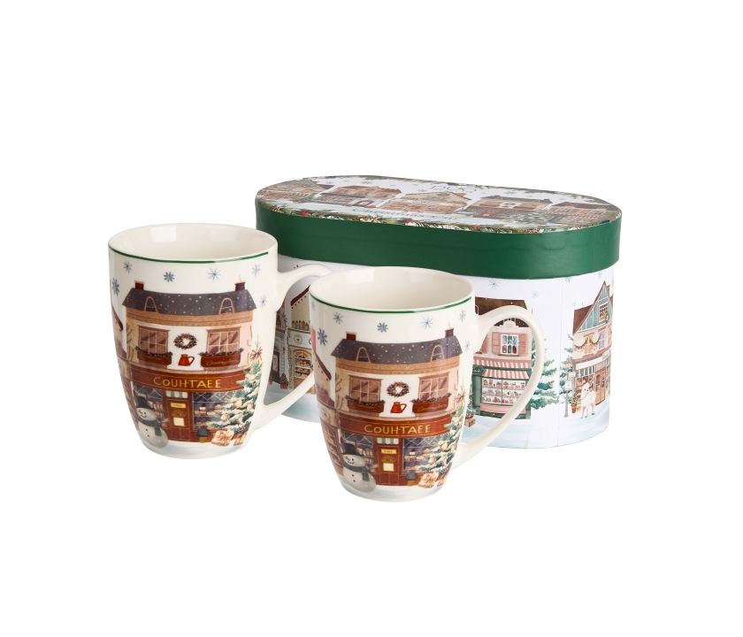 Sada dvoch klasických hrnčekov CHRISTMAS CITY 2 z vianočnej kolekcie, vyrobených z porcelánu New Bone China, ktorý sa vyznačuje elegantnou a prírodnou krémovo bielou farbou s jemným leskom a zároveň výnimočnou odolnosťou.