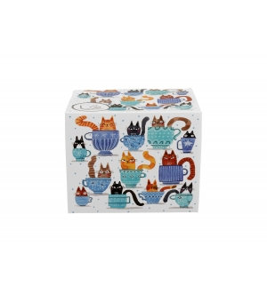 Kolekciu zdobí motív viacfarebných, nadýchaných domácich mačiek sediacich v porcelánových šálkach. Celý kus sa vyznačuje hravým štýlom a žiarivými, výraznými farbami.