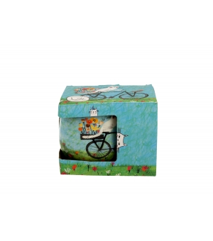 Líniu zdobí obrázok namaľovanej bielej mačky na klasickom bicykli. Celý výrobok sa vyznačuje hravým štýlom a žiarivými, výraznými farbami. Farebné pozadie a hravý mačací motív sú perfektnou voľbou nielen pre milovníkov domácich zvierat.