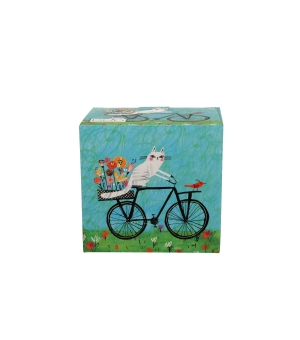 Líniu zdobí obrázok namaľovanej bielej mačky na klasickom bicykli. Celý dizajn je hravý a živý, s výraznými farbami. Farebné pozadie a hravý mačací motív sú perfektnou voľbou nielen pre milovníkov domácich zvierat.