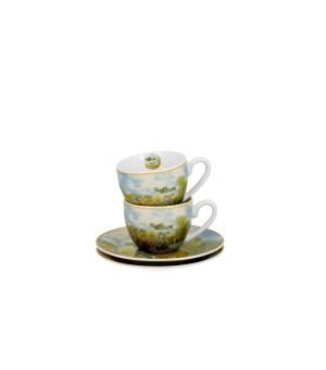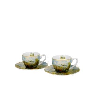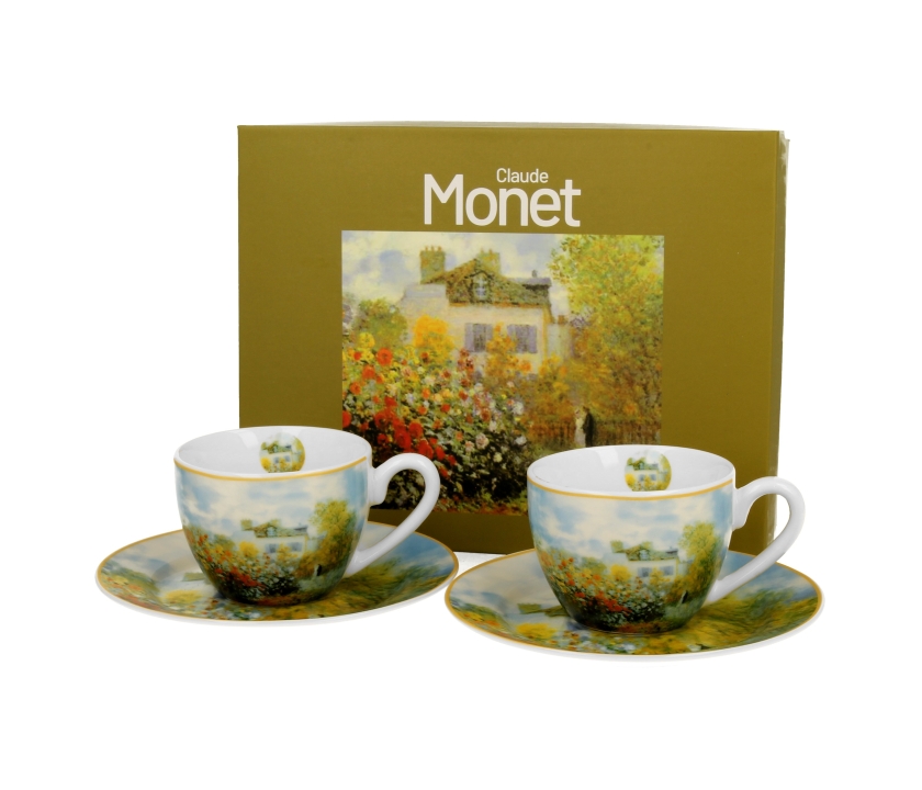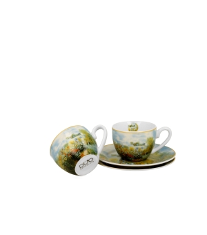 Dva šálky s podšálkami na espresso, ZÁHRADA V ARGENTEUIL, inšpirované C. Monetom, zo série Art Gallery, vyrobené z nového kostného porcelánu, charakterizované elegantnou a prirodzenou krémovo bielou farbou s jemným leskom, ako aj výnimočnou odolnosťou pri zachovaní ľahkého a jemného pocitu.