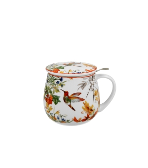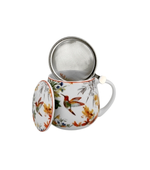 Sudový hrnček LINNEA s infuzérom, súčasť série Flower Classic, vyrobený z porcelánu New Bone China, vyznačujúci sa elegantnou a prirodzenou krémovo-bielou farbou s jemným leskom, ako aj výnimočnou odolnosťou.
