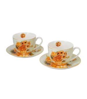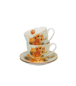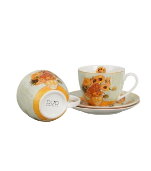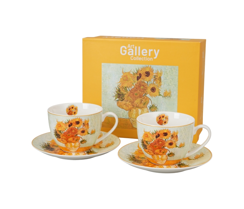 Dva šálky s podšálkami SUNFLOWERS inšpirované V. van Goghom, ktoré sú súčasťou série Art Gallery, sú vyrobené z porcelánu New Bone China, ktorý sa vyznačuje elegantnou a prirodzenou krémovo bielou farbou s jemným leskom, ako aj výnimočnou odolnosťou pri zachovaní ľahkého a krehkého pocitu.