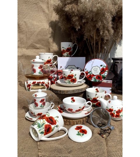 Kolekciu zdobí motív veľkých, výrazných makov v intenzívnej červenej farbe, ktoré symbolizujú vášeň, lásku a odvahu. Každý kvet bol starostlivo namaľovaný s dôrazom na detail a v prirodzených odtieňoch červenej, ktoré kontrastujú s dokonale bielym pozadím.