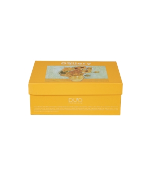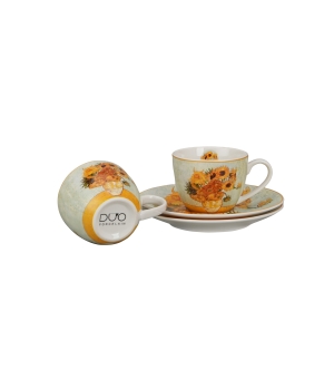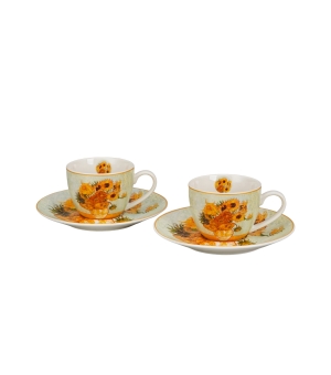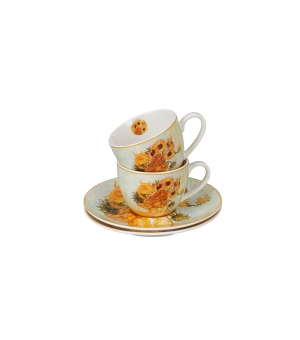 Dve šálky a podšálky na espresso SUNFLOWERS inšpirované V. van Goghom, ktoré sú súčasťou série Art Gallery, sú vyrobené z porcelánu New Bone China, ktorý sa vyznačuje elegantnou a prirodzenou krémovo bielou farbou s jemným leskom, ako aj výnimočnou odolnosťou pri zachovaní ľahkého a krehkého pocitu.