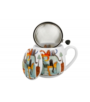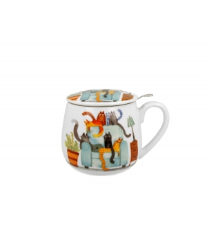 Hrnček Cat World CATS IN A CHAIR s objemom 430 ml, nálevníkom a viečkom, ktorý je súčasťou série Animals, je vyrobený z porcelánu New Bone China, ktorý sa vyznačuje elegantnou a prírodnou krémovo bielou farbou s jemným leskom a zároveň výnimočnou odolnosťou.