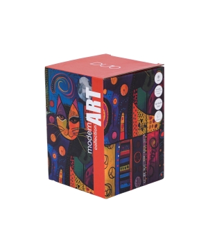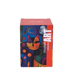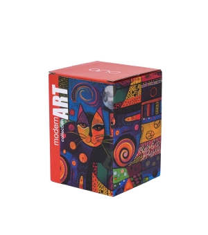 Zdobený motívom mačky, zaujme svojím tajomným a podmanivým pohľadom. Obklopený rozprávkovo farebnými mozaikami a dynamickými vírmi vás prenesie do sveta fantázie a kreativity, pričom spája umenie s moderným dizajnom.